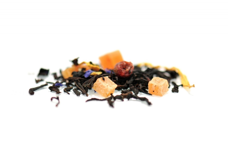Svart te naturligt smaksatt med persika och tropiska frukter. Dekorerat med solros, blå malva, papaya, aprikos, vinbär samt smultron. Fin svensk tetradition när den är som bäst, rund och fruktig i koppen.