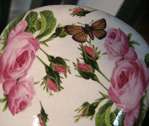 unik tekopp i keramik med vit glasyr, stora rosa rosor, fjärilar och insekter.