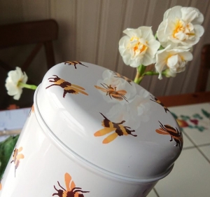 Rund teburk i mycket god kvalitet från Emma Bridgewater UK med motiv av bin. Insidan är emaljerad i cremefärg.