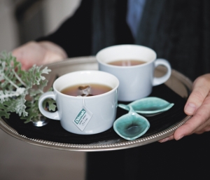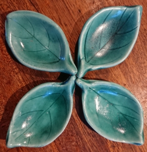 Handgjort litet fat för tepåsar eller tekulor som ser ut som ett litet teblad. Tillverkat i keramik, förpackad i en textilpåse, allt handgjort av byborna i Uda Walawe i Sri Lanka.