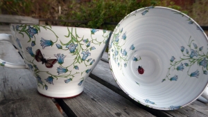 unik tekopp i tunn keramik med vit glasyr, blåklockor, fjärilar och insekter.