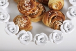 Fantastiskt kakfat på fot i vit keramik med många små rosor längs kanten! Mäter 25 cm i diameter och är 15 cm hög. Från Kerstin Tillberg, keramiker i Mölle.
