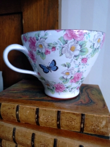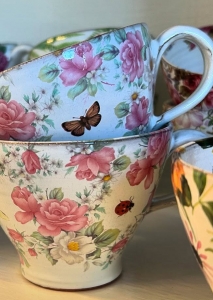 unik tekopp i keramik med vit glasyr, rosa rosor, vita blommor, fjärilar och insekter. Allt i mjuka pastelliga toner. Mönstret är något olika på alla koppar.