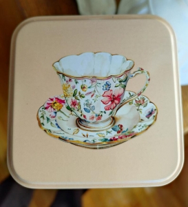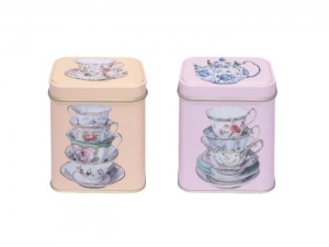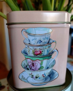 En charmig teburk med romantiskt motiv av staplade tekoppar i två olika motiv och mjuka pastellfärger. Detta avser den aprikosfärgade burken.