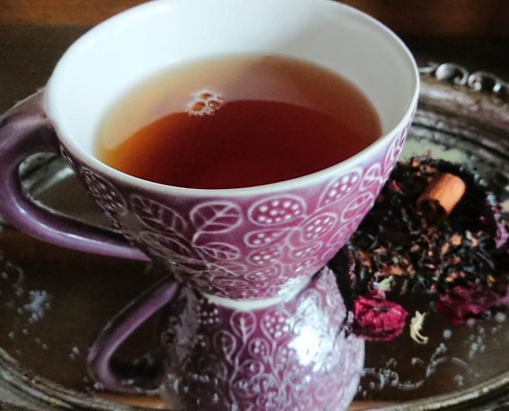 Svart te (blandning av fem olika sorters svart te) med naturlig smak av saftiga plommon, kryddig kanel och mjuk vanilj. Vackert dekorerat med kanelstänger, frystorkade plommonbitar, rosenblad och rosaklint.