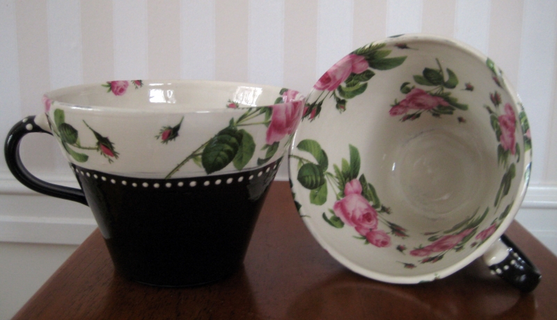 unik tekopp i keramik med nedre halvan av koppen i brunt, övre halvan och insidan i vitt med rosa och grönt rosmönster.