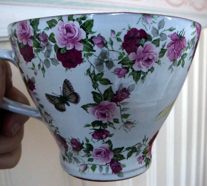 Mycket vacker, handgjord och helt unik tekopp i keramik med vit glasyr, vinröda och rosa rosor, fjärilar och insekter. Mönstret är något olika på alla koppar.